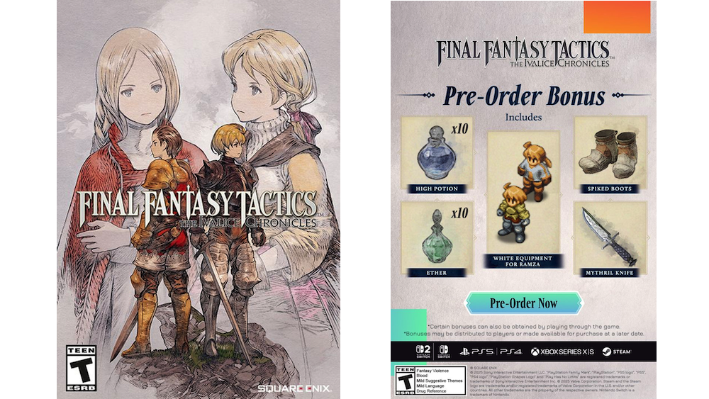 Embora a edição física esteja disponível apenas para o Switch PS5 e Nintendo, o Final Fantasy Tactics também será lançado digitalmente no PC (Steam), Xbox Series X | S, PS4 e Switch 2. Esta estratégia de liberação-edições físicas para Nintendo e Playstation Platforms-apenas se tornam muito comuns para o Square Enix nos últimos anos.