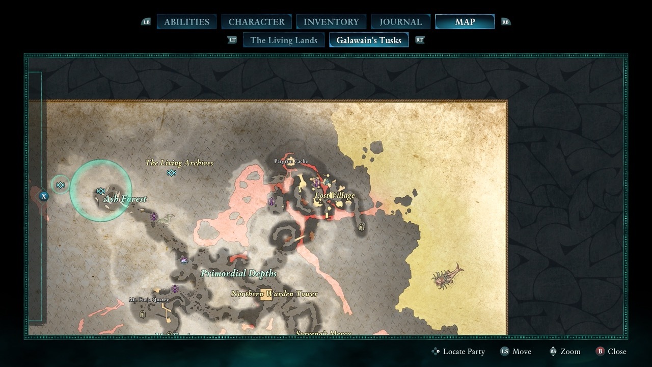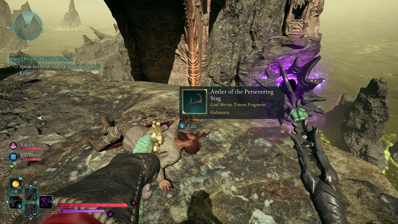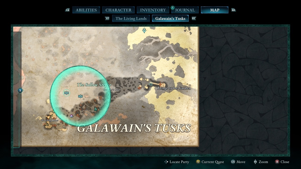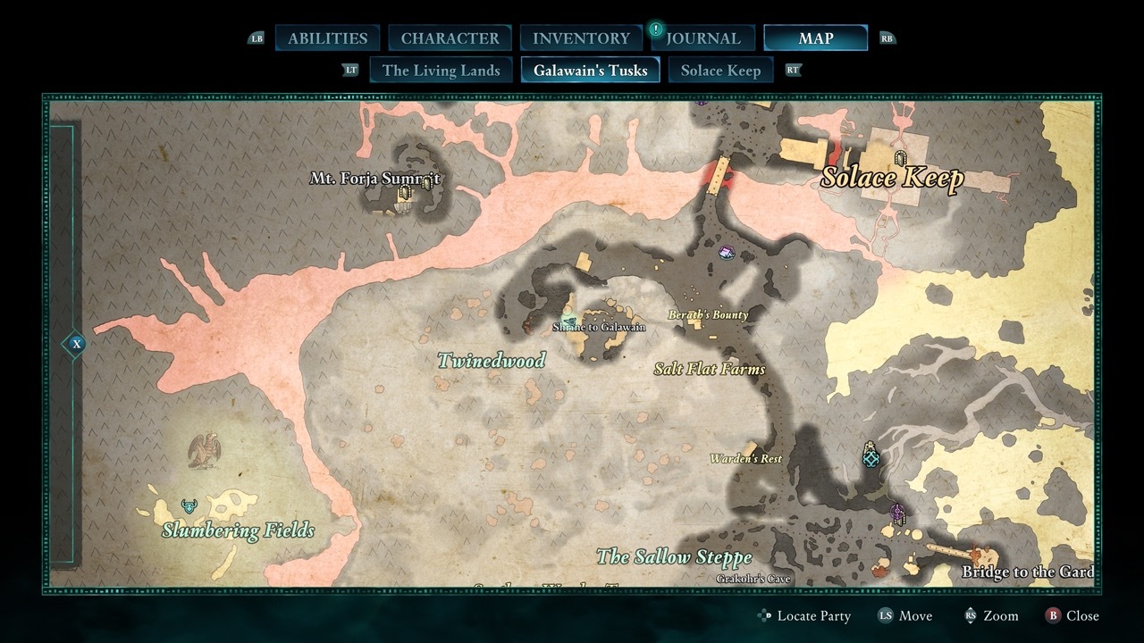 Em declarado, você pode encontrar e montar totens em cada região que fornece buffs passivos. Nas presas de Galawain, você pode montar o totem da perseverança encontrando a base do totem e seis peças em toda a região. Uma lista das peças do totem pode ser adquirida de um fornecedor no consolo, mas esta lista não fornece marcadores de mapa para as peças do totem. Depois de coletar as peças do totem, elas podem ser montadas no acampamento.