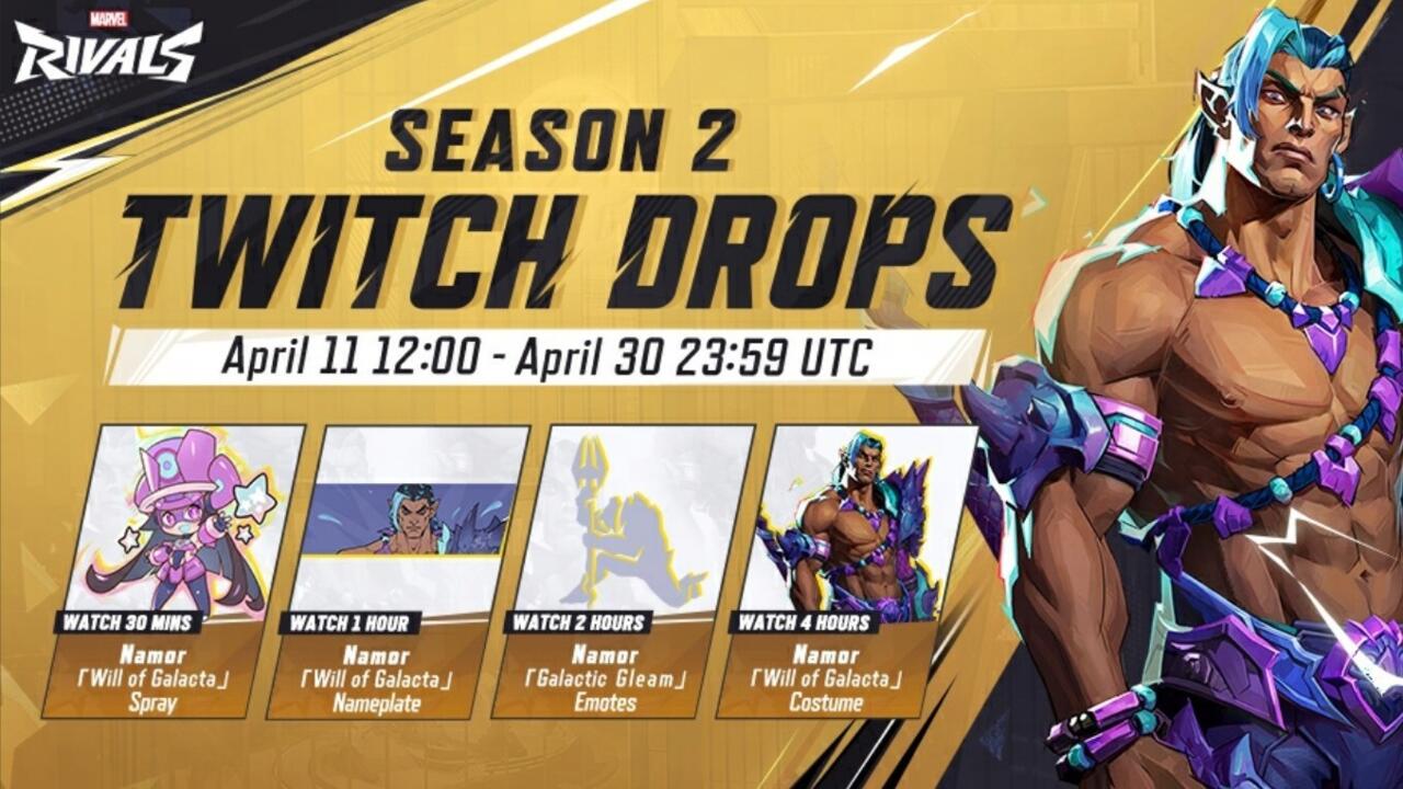 Em comemoração à segunda temporada da Marvel Rivals, haverá recompensas com temas de Namor que os jogadores podem ganhar como parte do mais recente evento do Twitch Drop do jogo. Este novo conjunto de recompensa inclui a vontade do figurino de Galacta para Namor e outros cosméticos.
