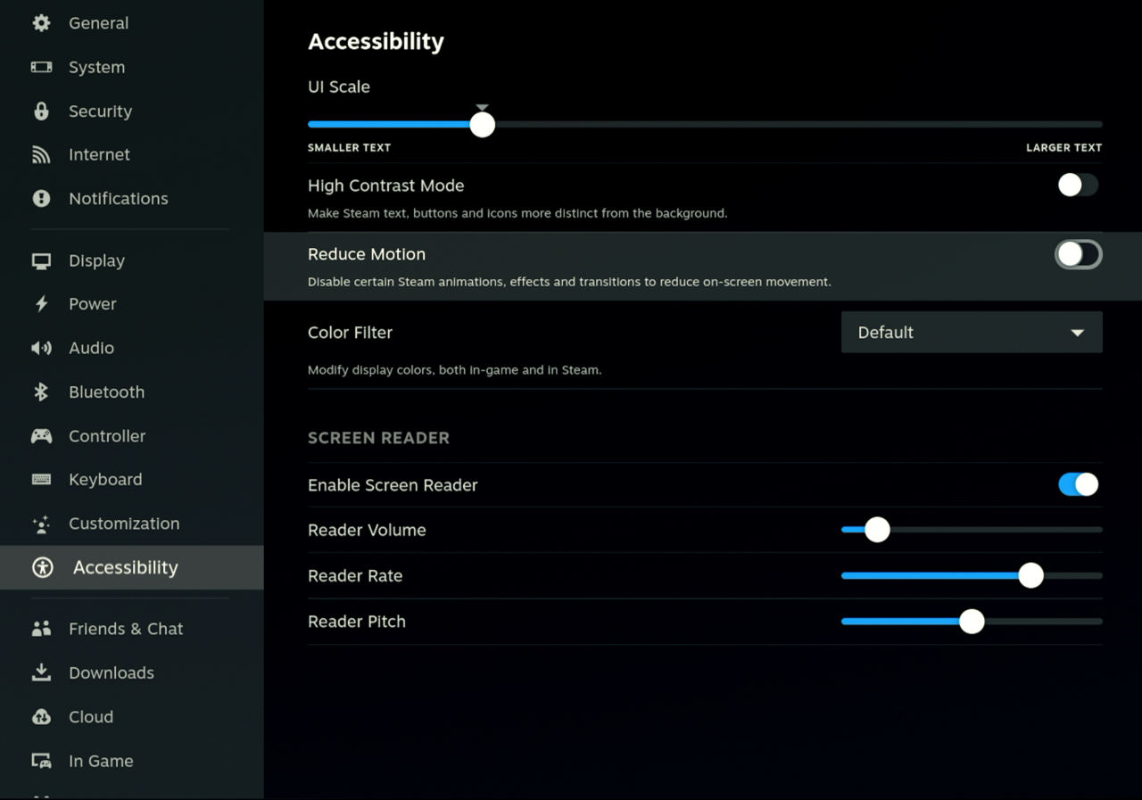 Especificamente, está adicionando uma opção de escala da interface do usuário, alterna para o modo de alto contraste e o movimento reduzido e as configurações adicionais de leitor de tela e filtro de cores. Agora, essas opções podem ser encontradas em um submenu de acessibilidade que agora faz parte dos menus de configurações do Steamos e Big Picture Mode. A imagem abaixo mostra exatamente como é este novo menu. Com essas adições, a Valve agora recomenda que os usuários do Steam que exijam recursos como os leitores de tela usem o modo Big Picture em vez do cliente Steam padrão.