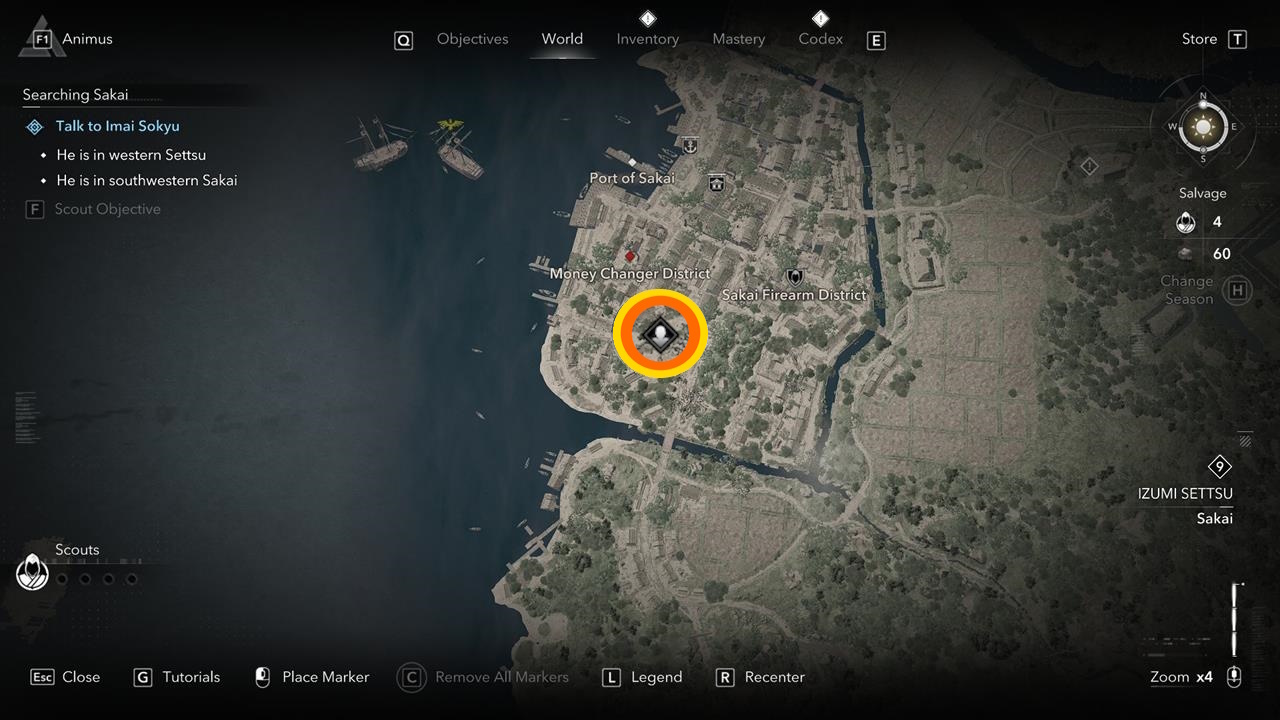 Sua primeira tarefa é encontrar Imai Sokyu nas sombras de Assassin’s Creed. Ele está na cidade de Sakai, que fica na costa leste da região de Izumi Settsu.